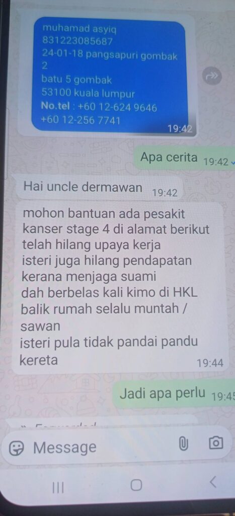 Sangat menyedihkan melihat seorang suami menghidap kanser tahap 4 dan isterinya terpaksa berhenti kerja untuk menjaganya. Tanpa pendapatan, mereka tidak dapat teruskan hidup.
