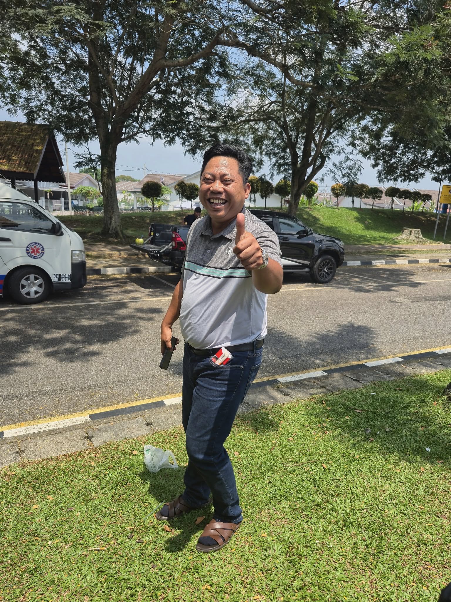 Jejaka hebat Melayu ini bersapa dengan saya. Beliau beli 2 biji kelapa muda dan berikan kepada aku untuk minum. Gerakan dia pantas dan secara santai. Lepas beri aku air kelapa, beliau bergerak ke ambulan kami dan hulurkan wang kertas kepada eskot saya. Aku tak tahu berapa kerana aku duduk dekat pondok nikmati air kelapa muda.